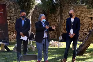 Pla obert del director de Tarraco Viva, Magí Seritjol; del conseller de Patrimoni de l'Ajuntament de Tarragona, Hermán Pinedo, en el debat inaugural de la XXII edició de Tarraco Viva. Imatge de l'11 d'octubre del 2020 (Hortizontal). - Mar Rovira (ACN)