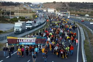 Ambient festiu i reivindicatiu entre els participants que protesten per la sentncia de l'1-O i provoquen retencions