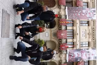 Pla tancat dels presidents i caps de colla de la Vella i la Joves de Valls, amb l'alcaldessa Dolors Farré, amb imatges del 3 de 9 sense folre i assenyalant que són a la plaa quilmetre zero del món casteller. Imatge del 20 d'octubre del 2020. (Vertical) - Núria Torres (ACN)