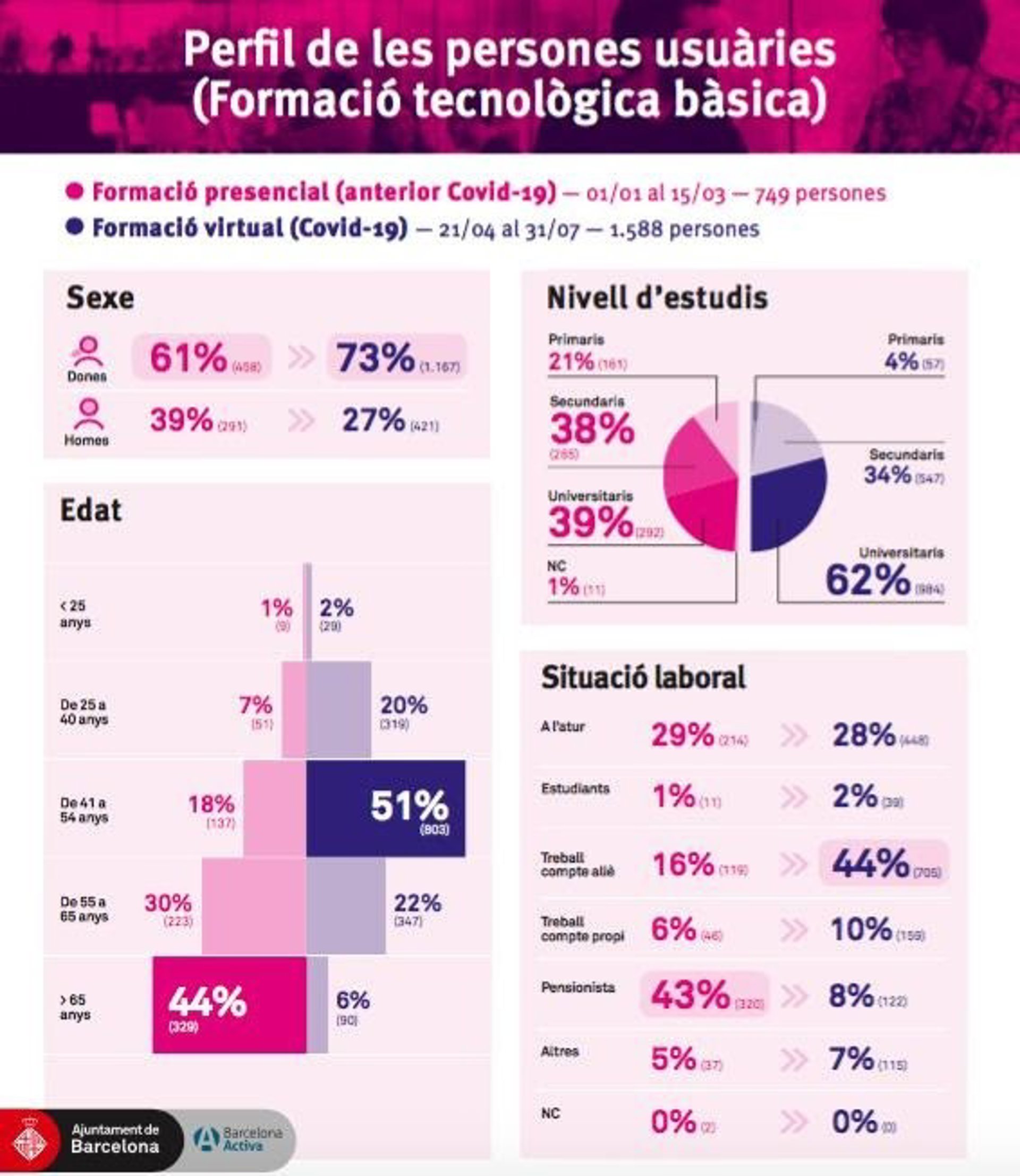 Segons les dades de l'Ajuntament, la demanda de programes de formació bsica sobre TIC ha pujat un 50%, fins a 1.500 persones i, en el context de la desescalada, Barcelona Activa ha dissenyat noves estratgies per arribar als collectius més vulnerables des del punt de vista de la bretxa digital.