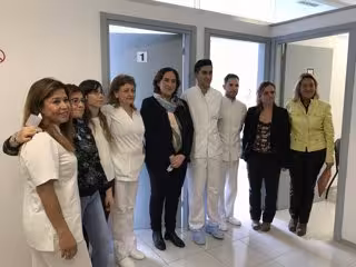 Ada Colau i Gemma Tarafa amb personal del servei d'odontologia municipal