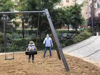 Una nena i el seu avi juguen en els gronxadors a l'interior de la poma Montserrat Figueres en el dia de la reobertura de les zones de joc