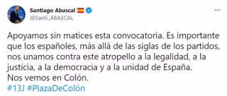 El líder de Vox, Santiago Abascal, ha manifestat aquest divendres el seu suport "sense matisos" a la concentració que ha convocat la plataforma Unión 78 el diumenge 13 de juny a la plaça Colón de Madrid en contra de concedir els indults als condemnats pel procés.