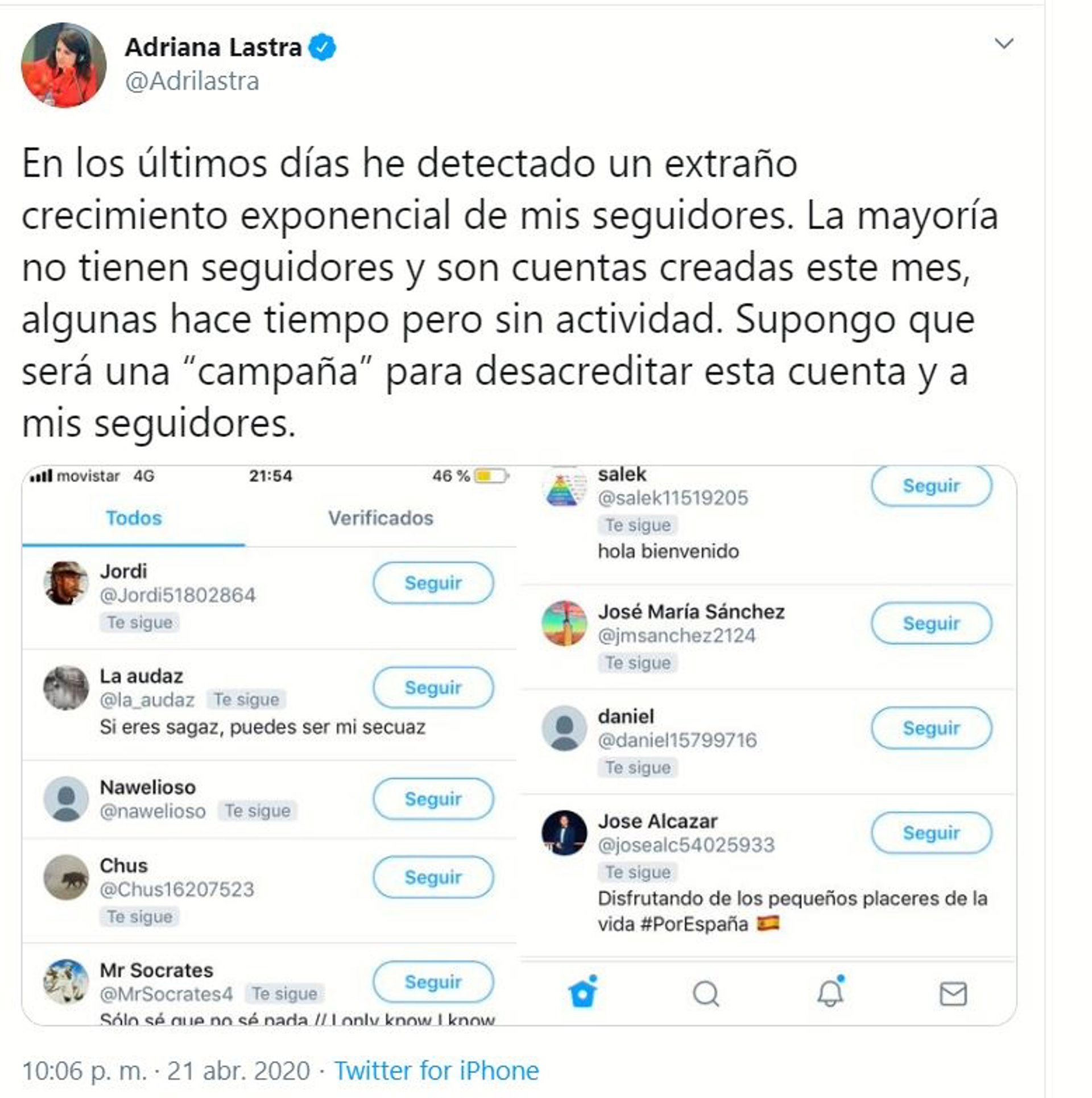 La portaveu del Grup Socialista al Congrés, Adriana Lastra, ha detectat aquests darrers dies "un estrany creixement exponencial" de seguidors en el seu compte de Twitter.