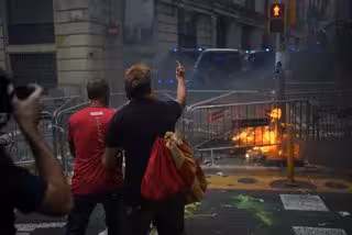 Entre els incidents provocats després hi ha hagut llanament de llaunes i algunes ampolles, també de petards i papers, i crema d'algun objecte de mobiliari urb i crits, mentre els agents antidisturbis esperen darrere de les tanques reforades que ja hi havia installades, i que també han acabat a terra en part.