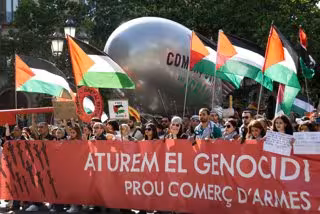 La pancarta de la capalera mostrava la llegenda 'Aturem el genocidi a Palestina. Prou comer d'armes amb Israel'.