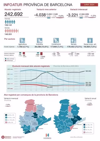 Es tracta d'un descens del -1,6% respecte al maig i del -1,3% en relació amb el juny del 2023, segons l'últim informe mensual d'atur registrat a la província, ha informat aquest dimarts la Diputació de Barcelona en un comunicat.