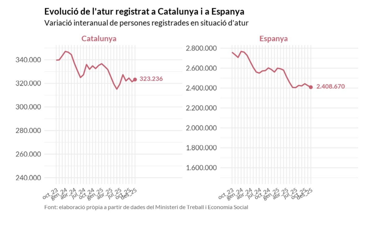Així ho ha expressat aquest dilluns en un comunicat després de la publicació de les dades d'atur del mes de desembre, que mostren una pujada en 1.860 persones al desembre a Catalunya (+0,58), mentre que, en comparació amb l'any passat, l'atur va disminuir en 11.959 persones (-3,57).