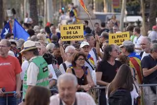 Alguns dels manifestants porten 'estelades' i la samarreta de la Diada 2024 i es van situant davant de l'escenari on tindr lloc un discurs breu de Puigdemont, abans de ser acompanyat fins a la Cambra catalana.