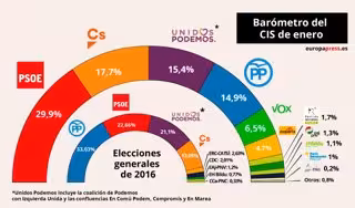 El Baròmetre d'Opinió del Centre d'Investigacions Sociològiques (CIS) corresponent al mes de gener torna a situar el PSOE al capdavant amb el 29,9% dels suports i l'augment d'un punt, i col·loca en segon lloc a 12 punts Ciutadans, que amb un 17,7% supera el PP.
