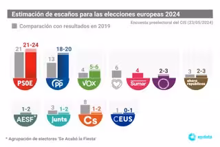 L'enquesta preelectoral del Centre d'Investigacions Sociològiques (CIS) per a les eleccions europees del 9 de juny situa el PSOE al capdavant amb un avantatge folgat de cinc punts sobre el PP, i atorga escons a Podem, Cs i la plataforma S'ha Acabat la Festa del comunicador Alvise Pérez.