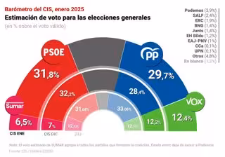El Baròmetre del Centre d'Investigacions Sociològiques (CIS) del mes de gener torna a situar el PSOE al capdavant per vuitè mes consecutiu, amb una estimació de vot del 31,8%, quatre dècimes menys que al desembre, i un avantatge de 2,1 punts sobre el PP, que obté un suport del 29,7%.