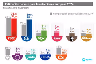 La segona enquesta del Centre d'Investigacions Sociològiques (CIS) per a les eleccions europees del 9 de juny, publicada aquest dilluns, manté al capdavant el PSOE amb un avantatge de prop de tres punts, dos menys que el sondeig del maig amb el qual es va obrir la campanya.