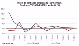 L'índex de confiança empresarial harmonitzat (ICEH) de Catalunya va créixer un 0,7% el primer trimestre respecte al quart trimestre del 2024, segons dades d'aquest dimarts de l'Institut d'Estadística de Catalunya (Idescat).