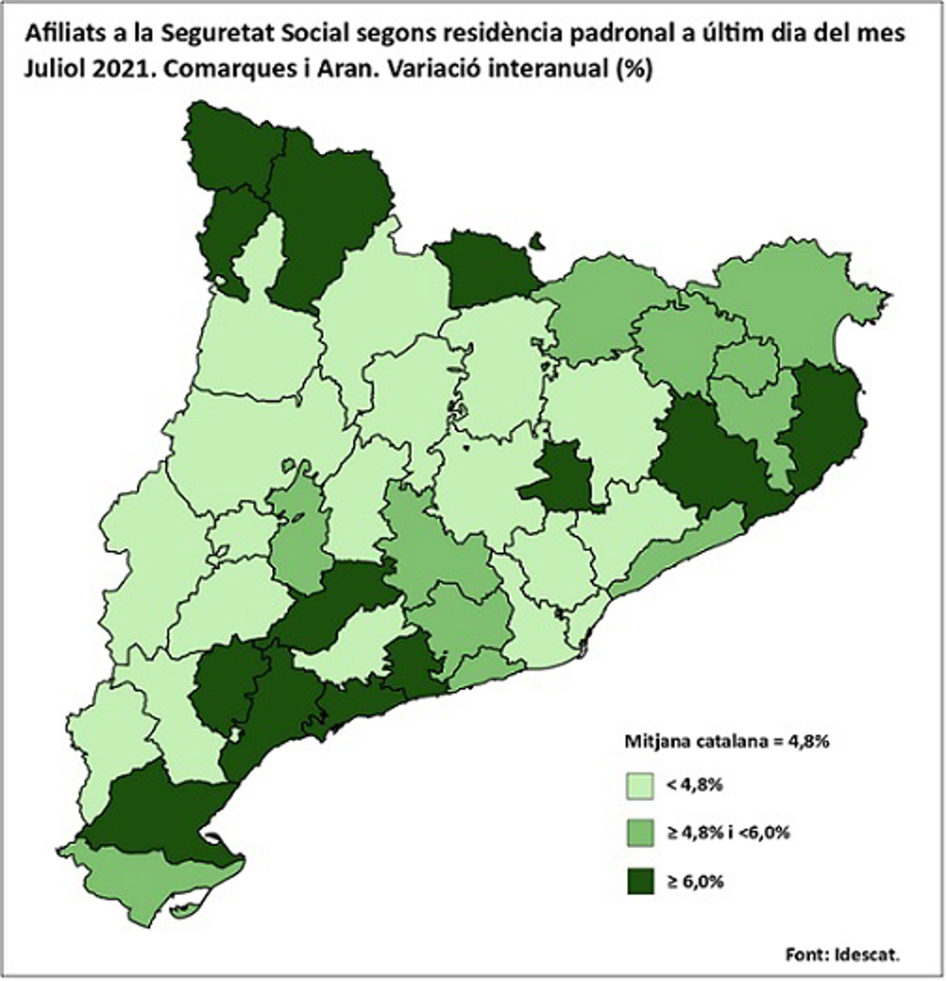 Respecte al mes anterior, el nombre d'afiliats a Catalunya va augmentar un 1,2% i va créixer en totes les comarques, amb els augments més elevats a Aran (Lleida), del 9,9%, i el Pallars Sobir, del 6,8%, mentre que els més modests han estat en el Valls Occidental, del 0,1%; el Valls Oriental, del 0,3%; Bages, del 0,4%, i Alt Peneds (Barcelona), també del 0,4%.