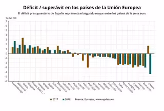 El dficit pressupostari d'Espanya es va situar al final del 2018 en el 2,5% del PIB, la qual cosa suposa una rebaixa de mig punt percentual respecte al desequilibri registrat l'any anterior, per representa el segon més gran entre els pasos de la zona euro, només per darrere del 4,4% de Xipre i en el mateix nivell que Frana, segons les dades publicades per Eurostat.