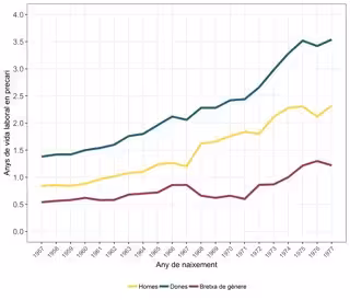 Les dades del temps creixen encara més entre les dones, passant d'1,5 anys a 2,6, les nascudes el 1978 han passat la meitat de la seva vida activa entre els 30 i els 39 anys en inseguretat contractual i les generacions posteriors, nascudes després del 1972, s'han vist més afectades.