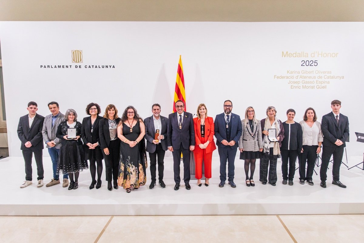 L'acte de lliurament d'aquesta medalla, celebrat aquest dimecres a l'auditori del Parlament, ha començat amb un minut de silenci amb motiu del primer aniversari de la dana, i també s'ha lliurat aquesta distinció a la Federació d'Ateneus de Catalunya i, a títol pòstum, als activistes socials Josep Gassó i Enric Morist.