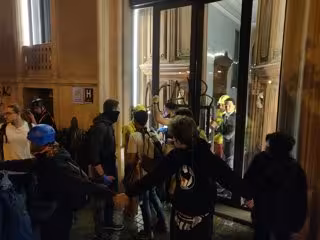 A l'exterior de l'edifici també ruixen la cara de manifestants amb aigua, per combatre la cossor dels gasos lacrimgens que fan servir els antiavalots.