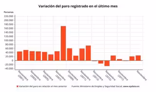 En el conjunt d'Espanya, el nombre de desocupats que s'ha registrat a les oficines dels serveis públics d'ocupació ha augmentat en 25.269 persones al novembre (+0,66%), per sota de la mitjana de la srie histrica, amb un total de 3.851.312 desocupats.