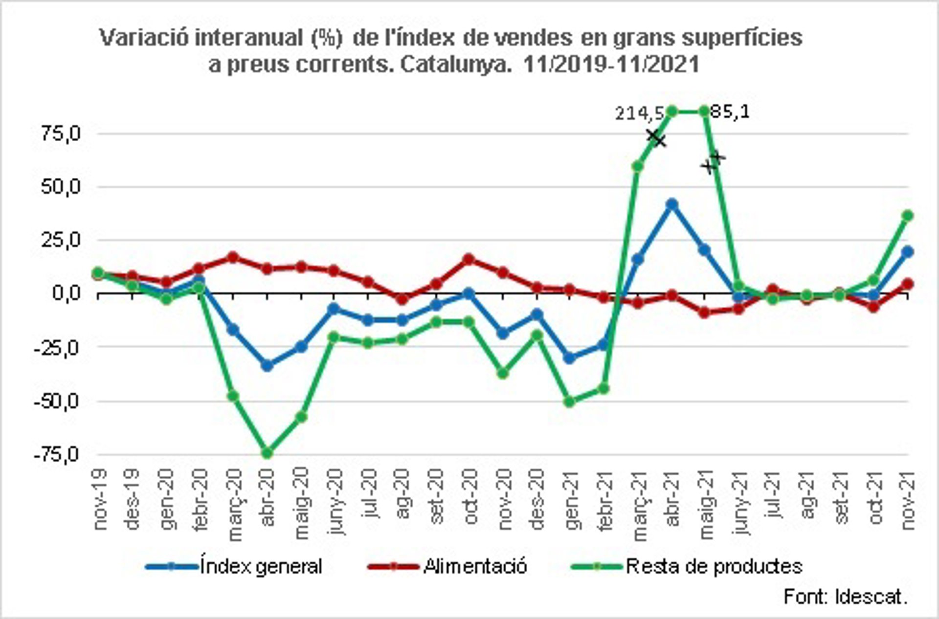 L'índex de vendes a les grans superfícies de Catalunya a preus corrents va augmentar un 19,6% al novembre respecte al mateix mes del 2020, segons les dades de l'Institut d'Estadística de Catalunya (Idescat).