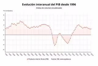 El PIB també va trepitjar una mica l'accelerador en valors interanuals en mostrar en el primer trimestre un creixement del 2,4%, una dècima superior al del trimestre anterior. La demanda nacional va contribuir amb 2,2 punts al creixement, tres dècimes menys que l'últim quart del 2018, mentre que la demanda externa va tornar a taxes positives i va aportar dues dècimes, en contrast amb les dues dècimes que va restar l'últim trimestre de l'any passat.