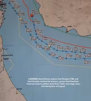 El ministre d'Exteriors irani, Mohamad Yavad Zarif, ha penjat en el seu compte de Twitter el traat per satllit de la ruta seguida per l'aparell, i en el qual s'aprecia que l'avió espia RQ-4 Global Hawk va estar dins de l'espai aeri irani durant gran part del trajecte.