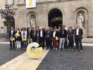 Tots els integrants de l'equip republic han presentat a la plaa Sant Jaume la nova imatge del "govern d'impuls", que s'illustra amb una gran lletra 'G' de color groc amb una fletxa en un dels seus extrems.