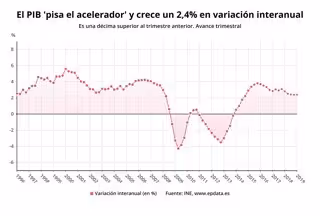 El PIB també ha pitjat l'accelerador en valors interanuals en mostrar en el primer trimestre un creixement del 2,4%, una dècima superior al del trimestre anterior. La demanda nacional va contribuir amb 2,2 punts al creixement, tres dècimes menys que en l'últim quart del 2018, mentre que la demanda externa va tornar a taxes positives i va aportar dues dècimes, en contrast amb les dues que va restar en l'últim trimestre de l'any passat.