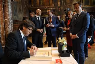 Puigdemont ha estat acompanyat del conseller d'Afers Estrangers, Relacions Institucionals i Transparència, Raül Romeva, i del representant permanent de la Generalitat davant de la UE, Amadeu Altafaj.