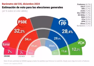 El Baròmetre d'Opinió del Centre d'Investigacions Sociològiques (CIS) del mes de desembre, el primer després de les acusacions del facilitador de la trama Koldo, Victor de Aldama, reflecteix una caiguda de dos punts del PSOE, que es queda en una estimació de vot del 32,2%, però en tot cas els socialistes continuen al capdavant i mantenen un avantatge de 3,8 punts sobre el PP, que també recula i s'anota un 28,4%.