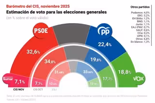 L'enquesta, publicada aquest dimarts, modera els resultats del mes d'octubre, quan el PSOE va marcar un dels seus millors registres (34,8%) i el PP la seva cota més baixa (19,8), la qual cosa va disparar a 15 punts la distància entre els dos grans partits.