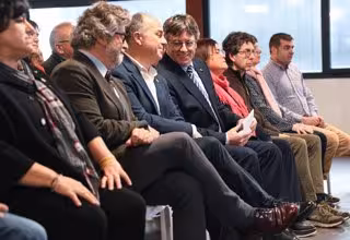 Amb el mateix fons blau que en l'acte d'Elna (França), en el qual no hi ha les sigles de Junts, els partits signataris de l'acord es comprometen a acompanyar Puigdemont "en el camí cap a la seva restitució en plenitud".