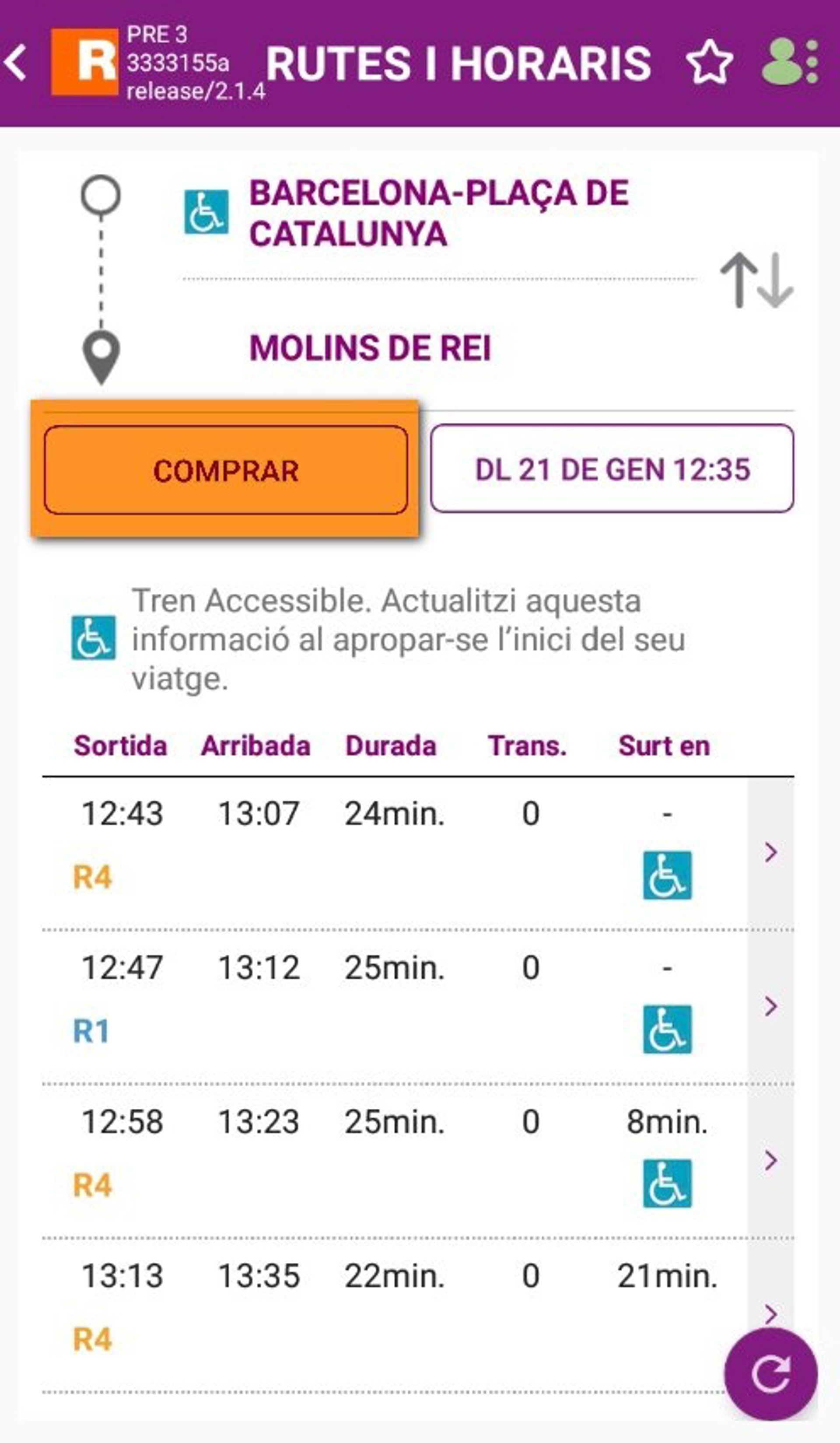 Renfe ha habilitat l'opció de compra de bitllets senzills de transport d'anada i tornada a través de l'aplicació mbil de Rodalies.