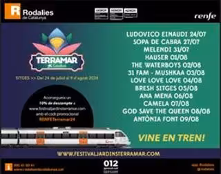 Renfe serà el "tren oficial" del festival Terramar CaixaBank que se celebra a Sitges (Barcelona) entre el 24 de juliol i el 9 d'agost, i que inclou concerts d'artistes com Ana Mena, Camela o Ludovico Einaudi, a més d'activitats gastronòmiques, de lleure i culturals, informa la companyia aquest divendres en un comunicat.