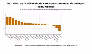 Gairebé totes les comunitats autnomes van guanyar afiliats estrangers entre l'1 i el 31 de maig, encapalades per Castella-la Manxa (+11,9%), Aragó (+11,7%) i Extremadura (+10,5%). Entre els descensos destaquen Andalusia (-1,4%) i les ciutats autnomes de Melilla (-4,5%) i Ceuta (-8,7%).