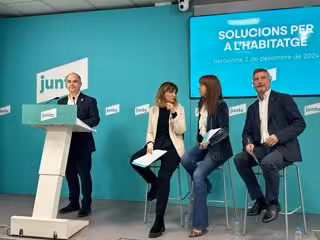 Acompanyat de la diputada al Parlament Glòria Freixa, la diputada al Congrés Marta Madrenas i el president de Junts a l'Ajuntament de Barcelona, Jordi Martí, han explicat els 25 punts que proposen per ampliar el parc d'habitatge de lloguer i compra.