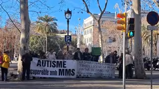 A l'entrada del Palau de Justícia, la desena de persones concentrades han donat suport a Pmies amb una pancarta que defensa 'Autisme recuperable amb MMS'.
