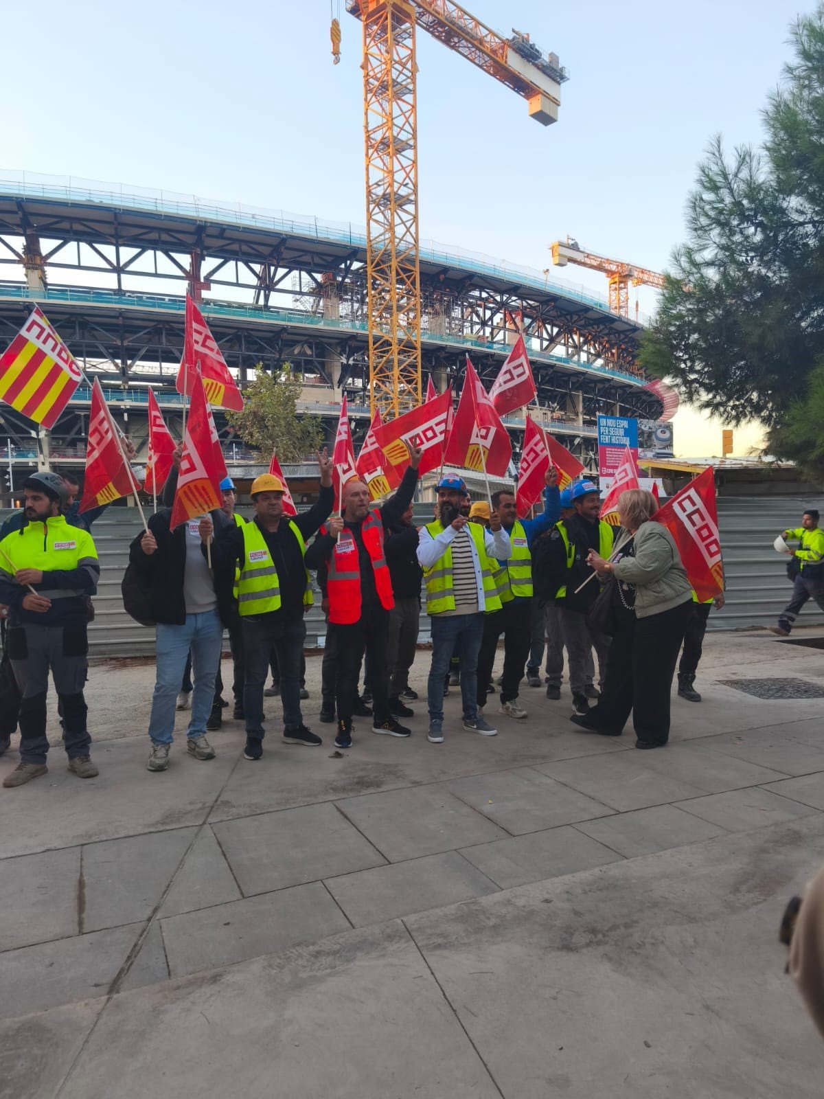 Una quarantena de persones s'han concentrat aquest dimarts davant el Camp Nou per criticar l'acomiadament d'uns treballadors en "situació irregular" de les obres de l'estadi del FC Barcelona.