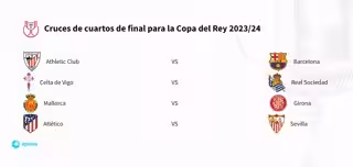 Athletic Club-FC Barcelona, RC Celta-Reial Societat, RCD Mallorca-Girona FC i Atlètic de Madrid-Sevilla FC són els emparellaments de la ronda de quarts de final de la Copa del Rei 2023-2024, segons el sorteig celebrat al Salón Luis Aragonés de la Ciudad de Fútbol de Las Rozas (Madrid).