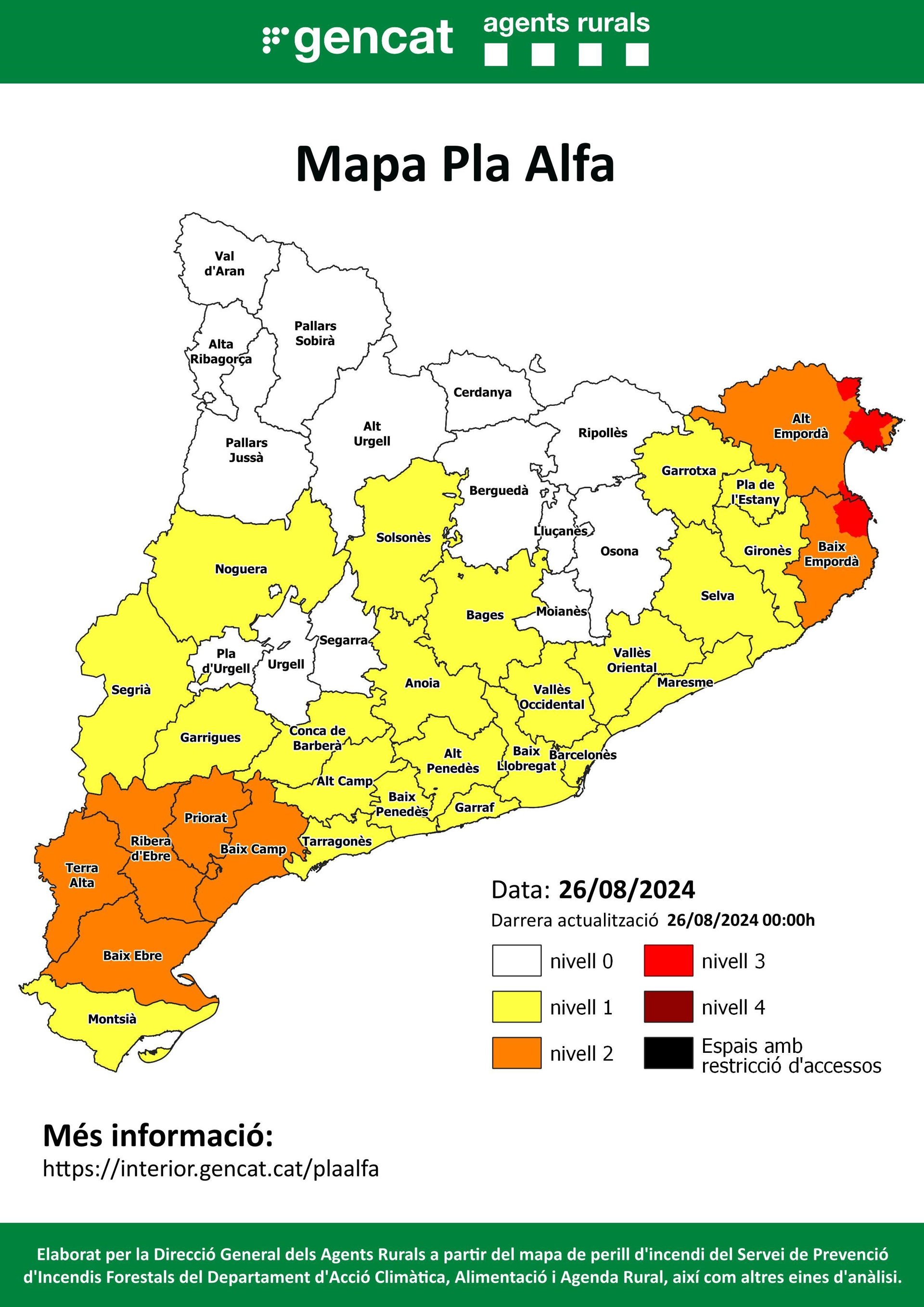 Aquest mapa mostra els nivells de risc d'incendi en el marc del Pla Alfa i les localitats en nivell 3 (perill molt alt d'incendi), que es troben a les comarques de l'Alt Empordà i el Baix Empordà.