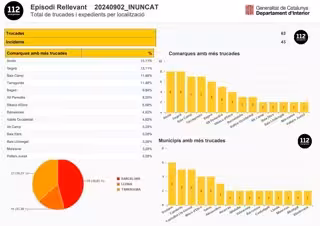 El 46,03% dels avisos procedien de la província de Barcelona, amb 29 trucades, seguides de les 23 realitzades a Tarragona (36,51%) i les 11 de Lleida (17,46%), informa el 112 a través d'un missatge a X recollit per Europa Press.