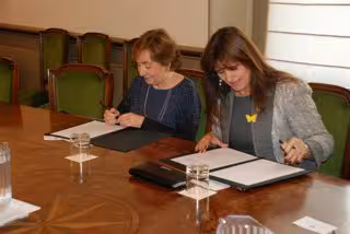 La consellera de Cultura, Laura Borrs, i la presidenta d'Abacus Cooperativa, Maravillas Rojo, han signat el migdia d'aquest dimarts el document de donació de l'arxiu histric de la cooperativa a la Generalitat, que es conservar a l'Arxiu Nacional de Catalunya.