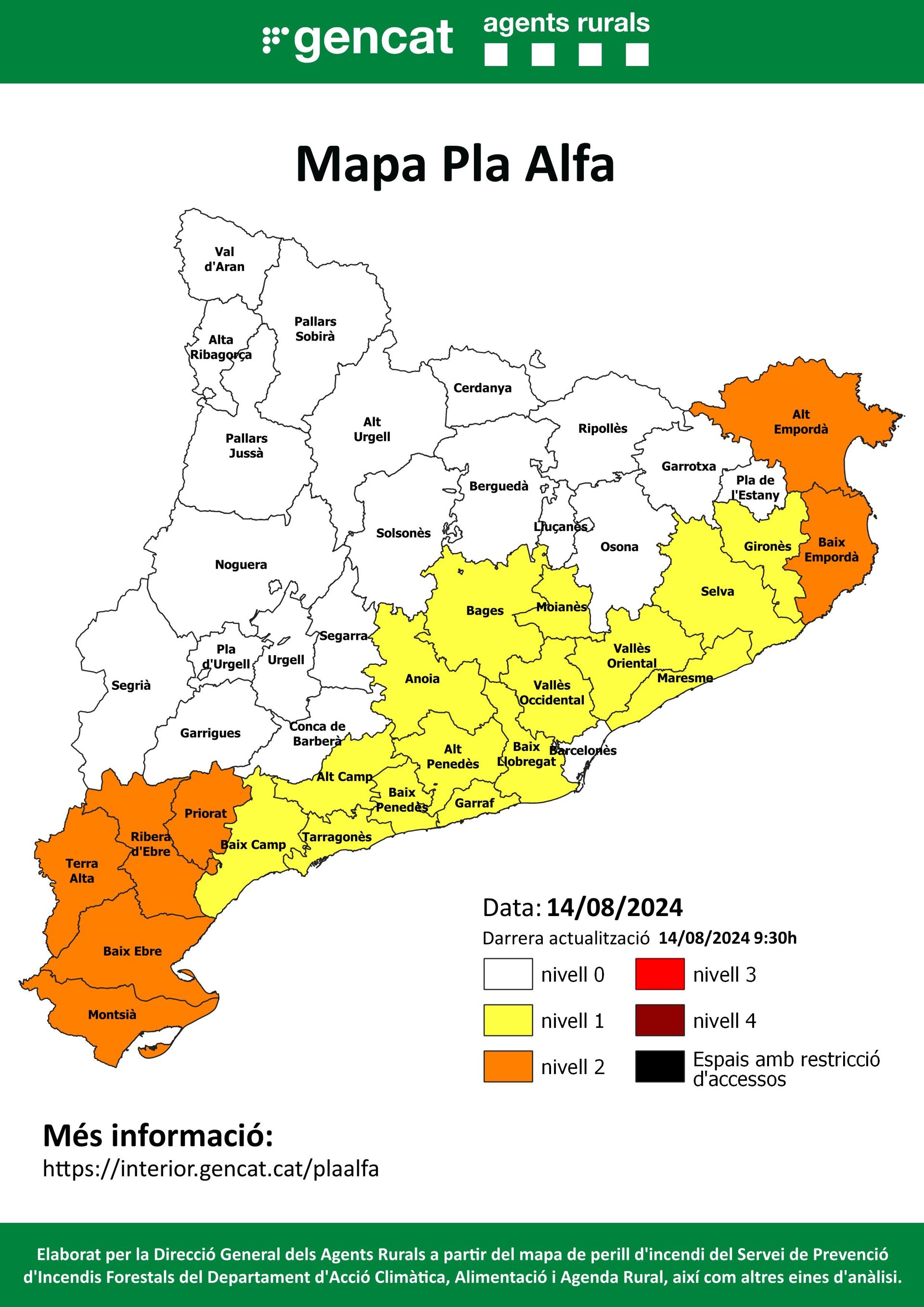 Sí estan en nivell 2 (perill alt) les comarques del Montsi, el Baix Ebre, la Terra Alta, la Ribera d'Ebre, el Priorat (Tarragona), el Baix Empord i l'Alt Empord (Girona), mentre que la resta de províncies es troben en nivell 1 (moderat) o nivell 0 (baix).