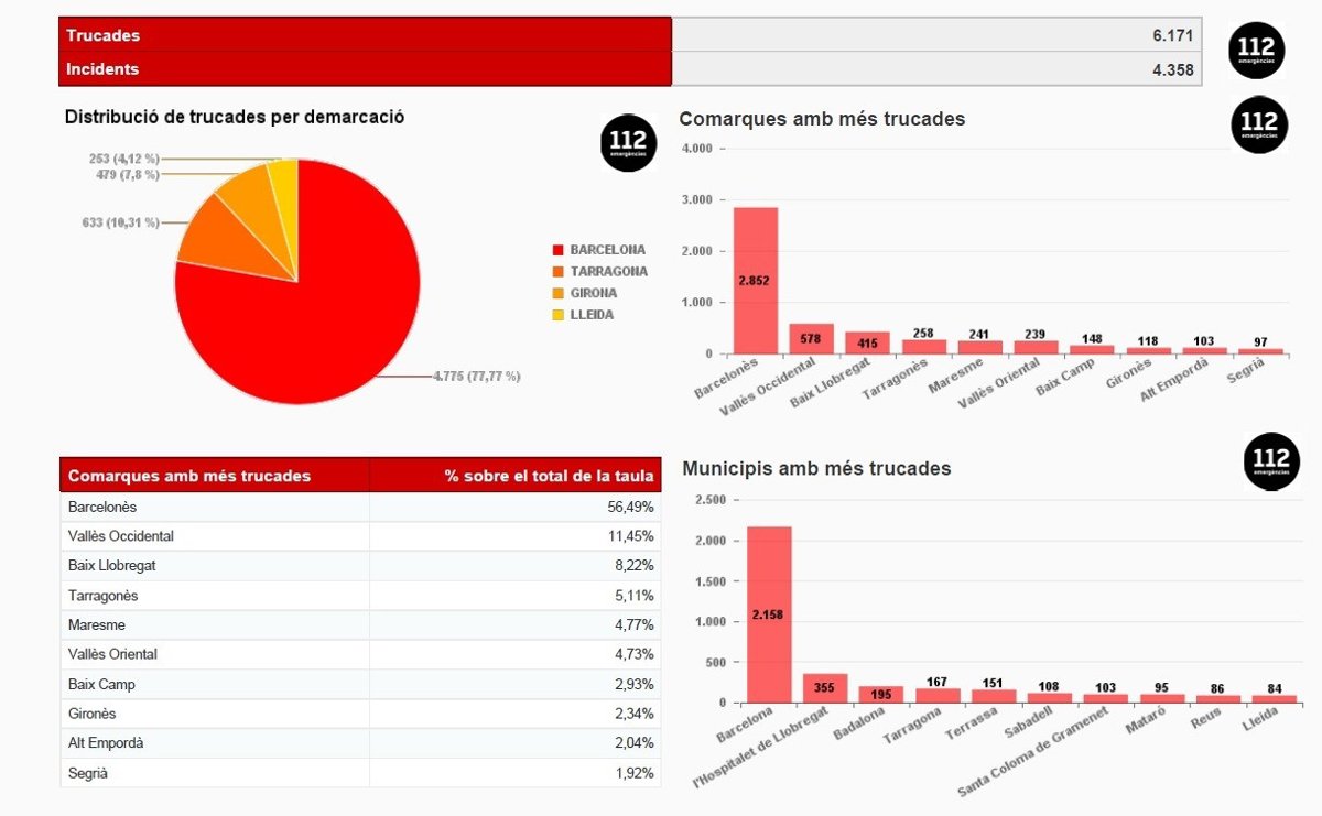 Per comarques, 2.852 trucades procedeixen del Barcelonès, 578 del Vallès Occidental i 415 del Baix Llobregat, informa el 112 en un missatge a X recollit per Europa Press.