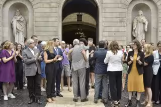El president de la Generalitat, Pere Aragonès, i l'alcalde de Barcelona, Jaume Collboni, han encapçalat aquest dilluns a les 12 hores a la plaça de Sant Jaume de Barcelona un minut de silenci per l'assassinat d'una dona la matinada d'aquest diumenge al districte de Nou Barris de la ciutat.