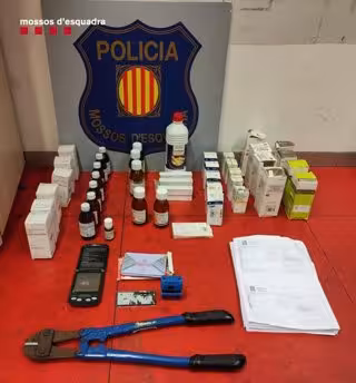 També van trobar més de 300 comprimits d'ansiolítics i derivats de benzodiacepines, una quantitat que apuntava que la seva finalitat era el comer i trfic, i van intervenir una vintena de caixes buides d'altres medicaments, ampolles buides, blísters i una bscula de precisió.
