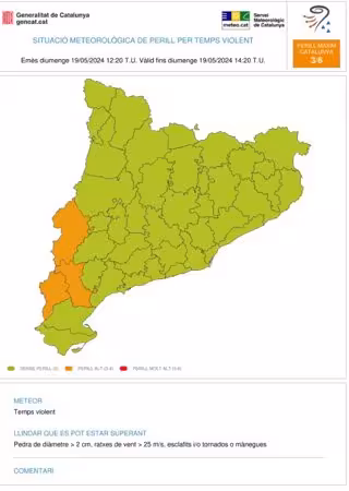 El Servei Meteorològic de Catalunya (Meteocat) ha emès un avís per possibilitat de temps violent a les comarques tarragonines de la Terra Alta i la Ribera d'Ebre i a la comarca lleidatana del Segrià.