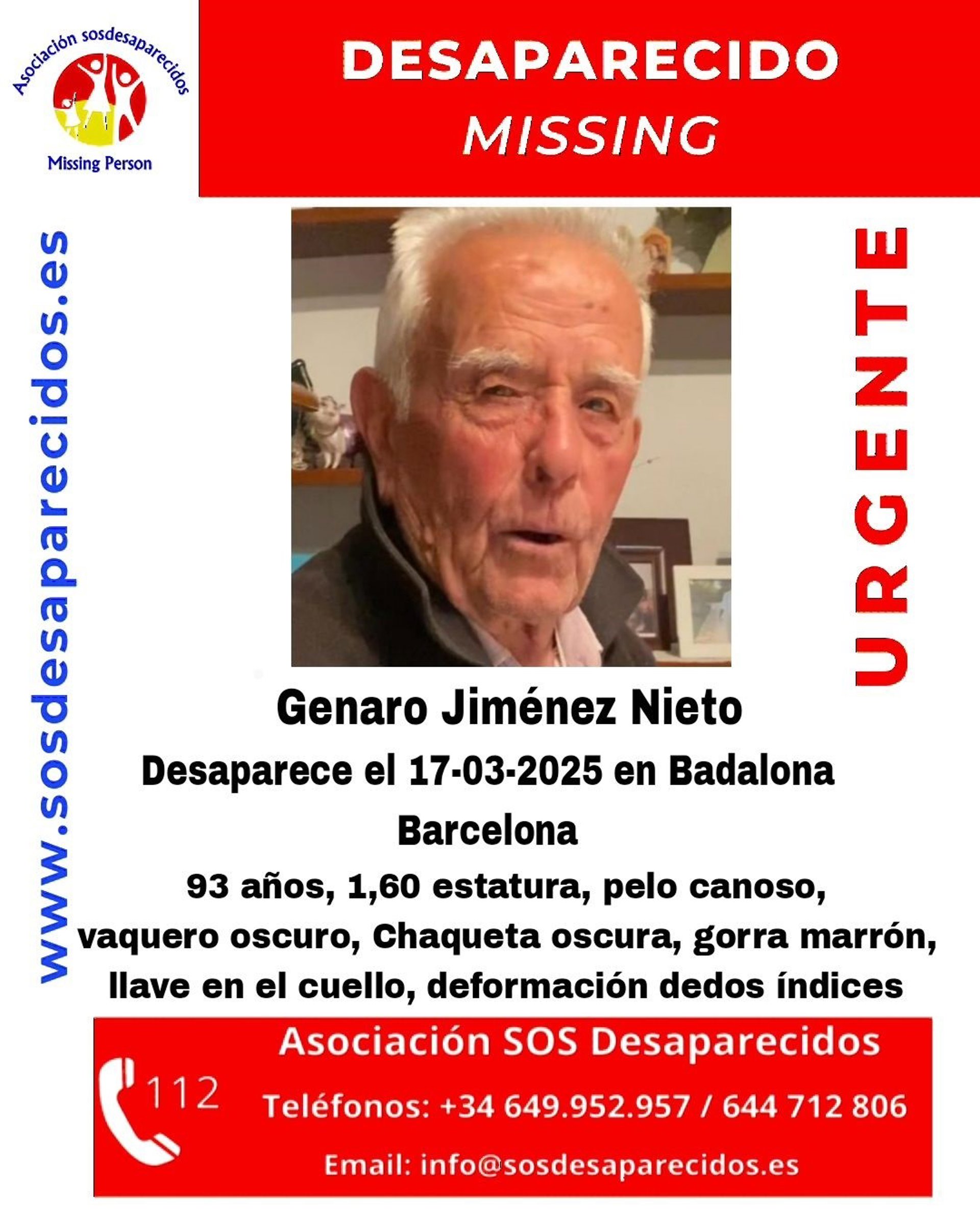 En un comunicat, l'associació ha detallat que es tracta de Genaro Jiménez Nieto, de 93 anys, 1,60 metres d'alçada, cabell blanc, ulls clars i una deformació als dits índex.