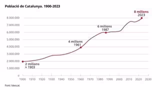 En una perspectiva a llarg termini des del 1900, la població de Catalunya s'ha duplicat dues vegades en períodes d'aproximadament sis dècades: de 2 a 4 milions i de 4 a 8.